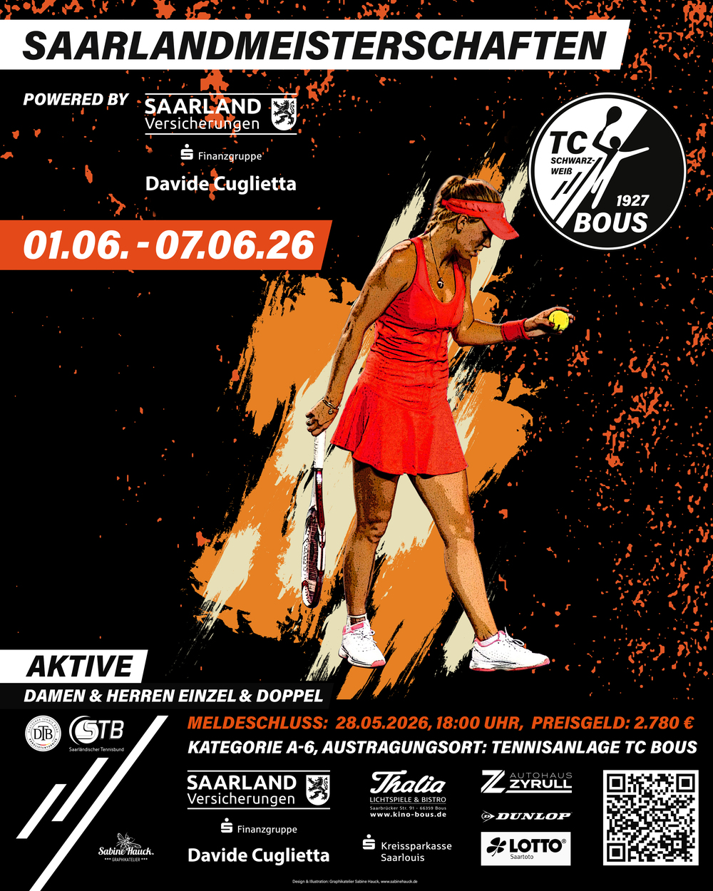 Auch im Jahr 2026 ist der TC Schwarz-Weiß 1927 Bous e.V. wieder Gastgeber der Saarlandmeisterschaften der Aktiven Damen und Herren. Vom 01.06. bis 07.06.2025 kämpfen die besten Spielerinnen und Spieler des Saarländischen Tennisbundes um die begehrten Titel der Saarlandmeister 2026. Das traditionsreiche DTB-Ranglistenturnier der Kategorie A-6 ist mit einem Preisgeld von 2.780 € dotiert und wird erneut vom Saarländischen Tennisbund e.V. ausgerichtet. Neu in diesem Jahr: Doppelkonkurrenz Damen & Herren! Die Gewinner der Einzelkonkurrenzen erhalten je 1 Wildcard für die Qualifikation für fol-gende Turniere: W15 Merzig Ladies Open Saar, M15 Saarlouis Saarland Open 2026.